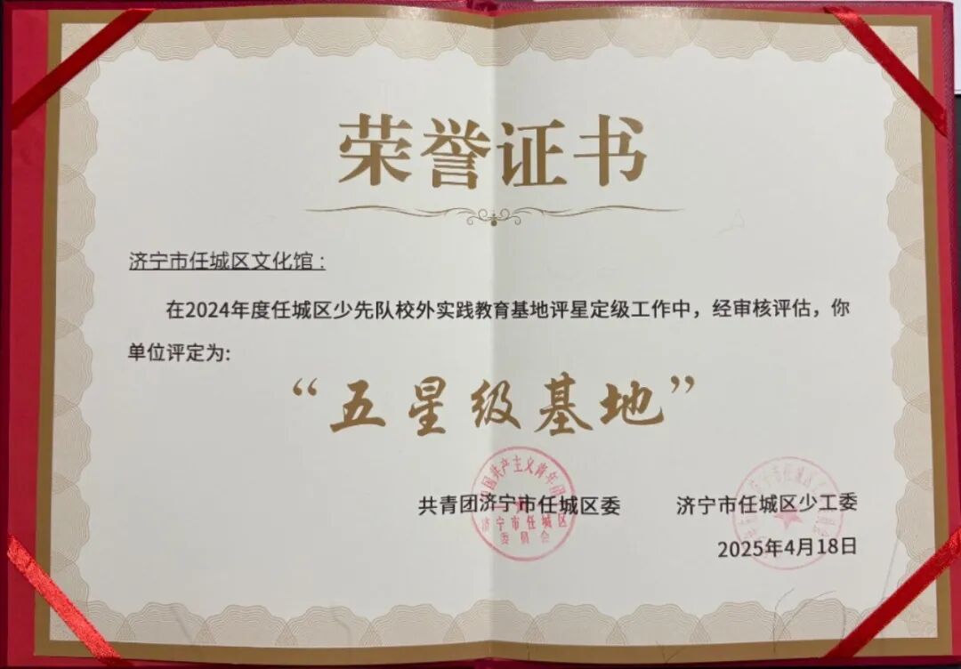 任城区文化馆荣获任城区少先队校外五星级培训基地。